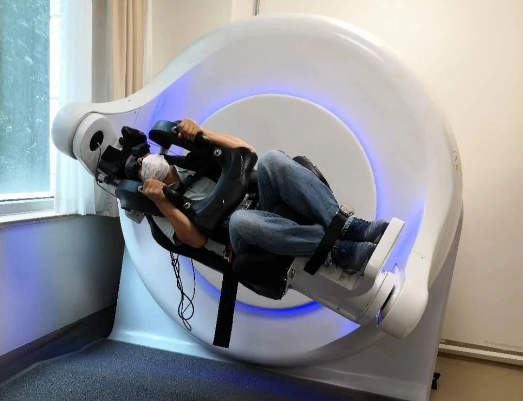 手法复位需要医生熟悉复位方法和一张治疗床,目前这种条件在门诊很难实现了,机器复位有专门的设备如图所示,看上去很科幻,其实就是可以让患者固定在特殊椅子上,按照特殊的检查动作运动来实现检查复位的目的。